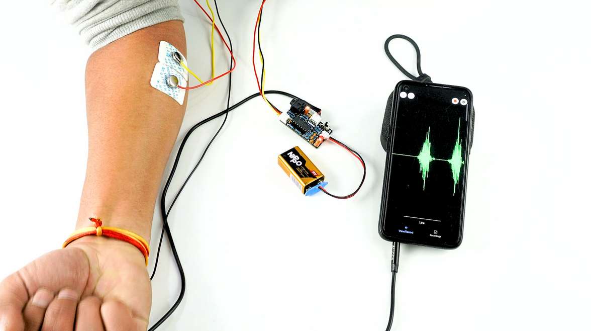 Ini adalah amplifier biopotensial portabel berukuran kecil dengan setup tanpa kode untuk merekam dan mendengarkan sinyal otot Anda (EMG) secara non invasif. Yang terbaik adalah bahwa itu tidak memerlukan mikrokontroler (seperti Arduino) untuk mengambil sampel sinyal. Anda hanya perlu mencolokkan baterai 9V ke papan, elektroda ke tubuh, dan jack audio ke ponsel/laptop, dan Anda siap merekam sinyal dari otot (EMG) menggunakan perangkat lunak seperti audacity atau aplikasi spike recorder Backyard Brain.