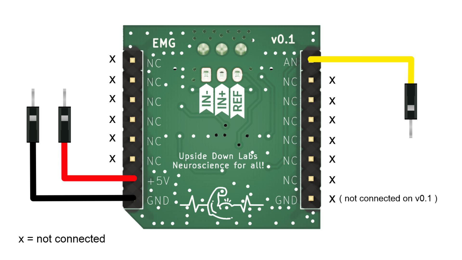 Anda dapat langsung menghubungkan kabel jumper jantan ke betina pada pin header Muscle BioAmp Blip di 5V, GND, AN.