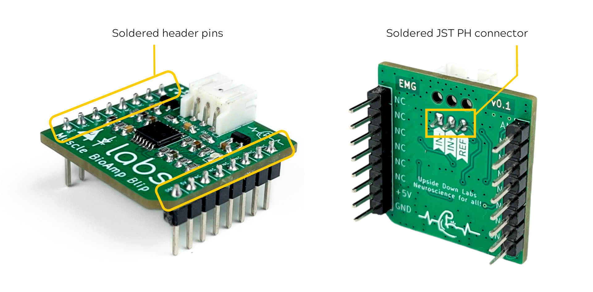 Solder pin header dan konektor JST Ph 2.0mm pada Muscle BioAmp Blip seperti yang ditunjukkan di bawah. Jika Anda memesan kit dirakit maka Anda dapat melewati langkah ini dan langsung ke langkah 2.